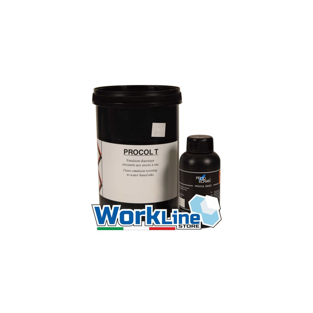 Gelatina Emulsione per Inchiostri ad Acqua Procol TProcol T è un'emulsione Diazoica resistente solo agli inchiostri a base acqua, per l'alto contenuto di materiale solido (45%) è raccomandato l'uso nell'industria tessile. Contrasto molto buono. Viene fornita con il suo Diazo in polvere. Buona conservazione.