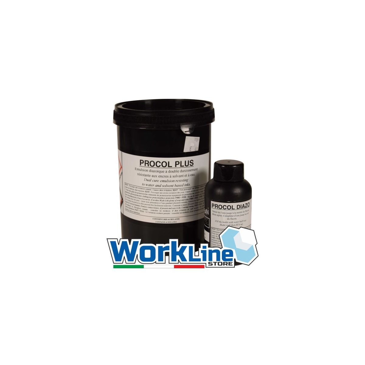 Gelatina Emulsione Universale Procol PlusPROCOL PLUS è un'emulsione Diazoica per tutti i lavori più comuni. Resiste sia agli inchiostri a solvente che a base acqua. Questa emulsione è caratterizzata da un'esposizione molto veloce ed una durata di conservazione di 24 mesi a temperatura di 20°. Colore BLU.